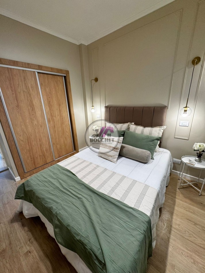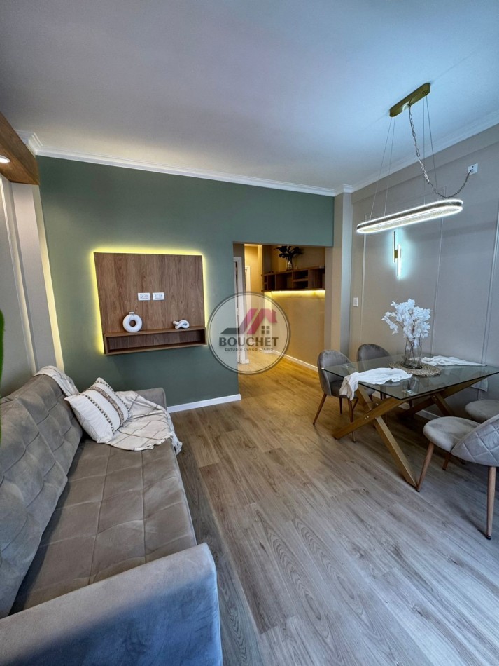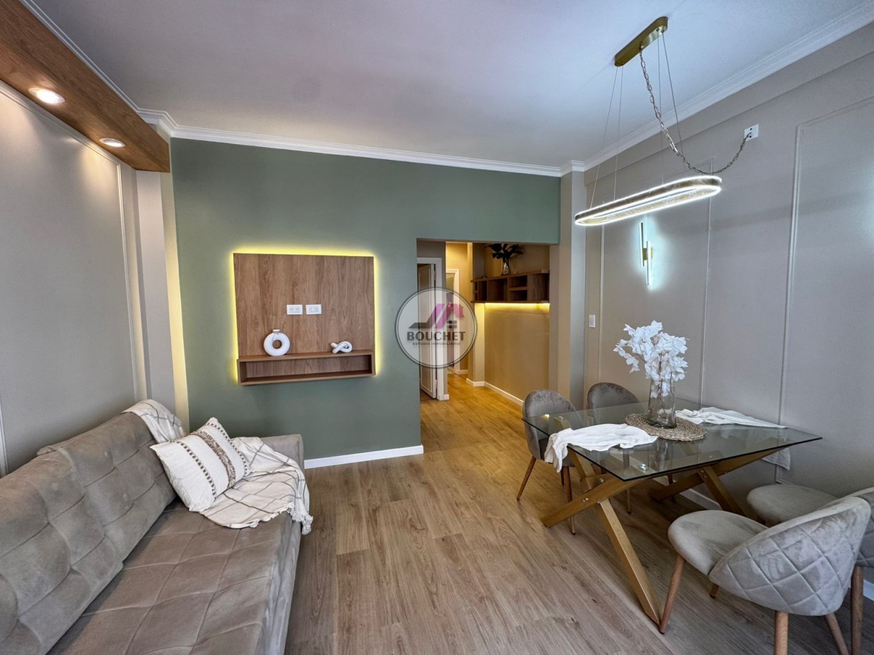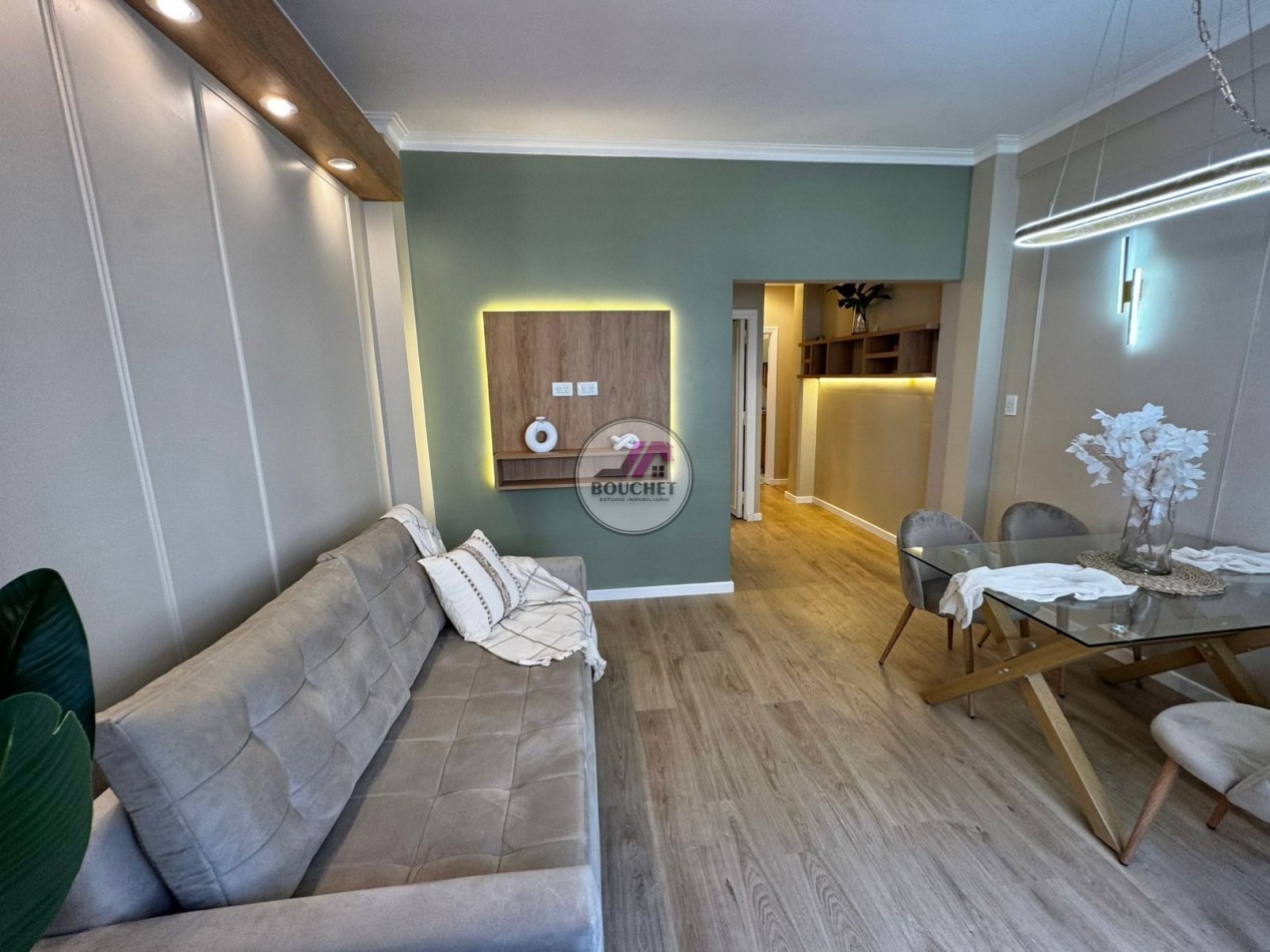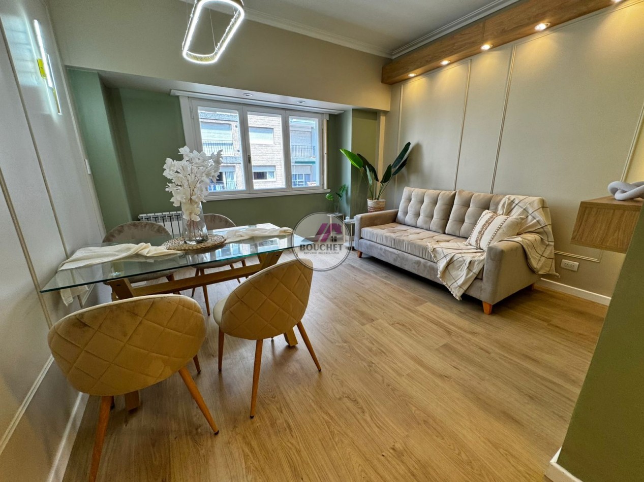 La unidad se encuentra en un 3º piso y se destaca por su amplitud, luminosidad y calidad de terminaciones. El living-comedor a la calle ofrece un espacio cómodo y moderno, equipado con mesa de diseño y sillas, sillón de pana y rack de TV en madera con iluminación LED, aportando calidez y estilo.