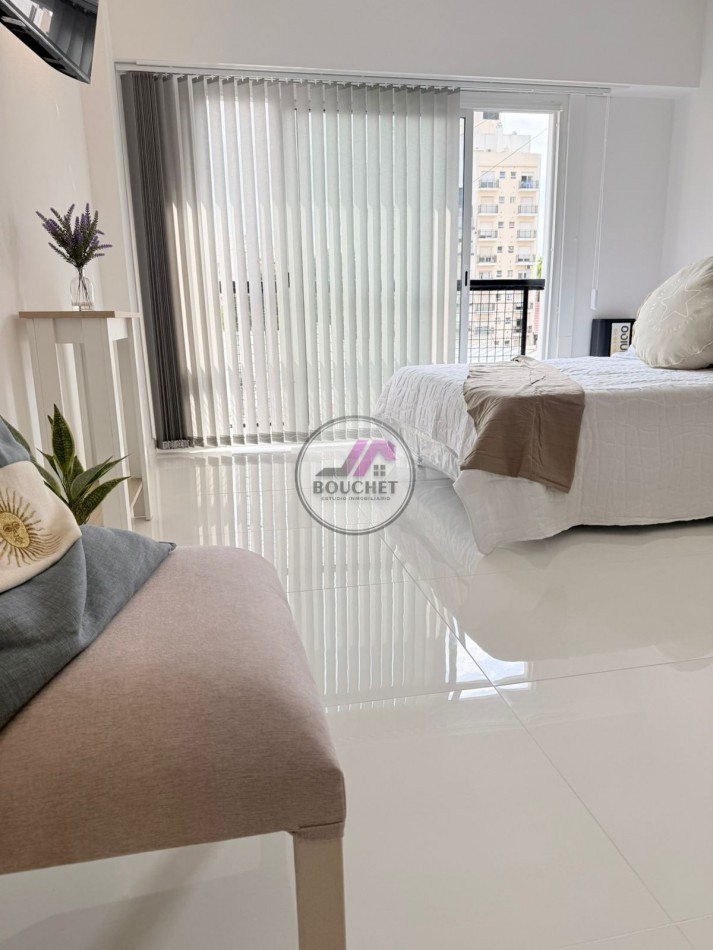El ambiente es amplio, ideal para living comedor y sector dormitorio, equipado con sommier de dos plazas con respaldo y salida al balcón francés.