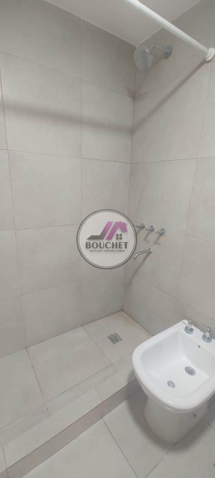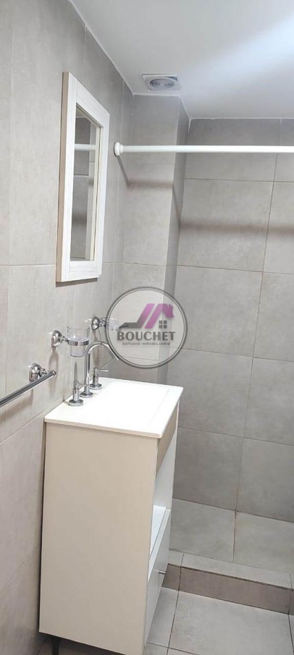 El baño es completo, revestido íntegramente en cerámicos, con vanitory, ducha y extractor de aire.